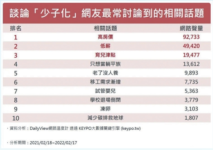 2021年網路在談論到「少子化」相關議題中,聲量最高的是高房價;其次是低薪,排在第二名,面對通貨膨脹來襲,擔心養小孩的經濟壓力難以負擔,讓網友留言「薪水不高真的不敢生」。