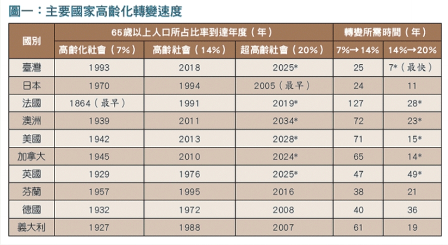 人口結構的變遷,對國家經濟及社會發展有重大及深遠的影響。根據聯合國世界衛生組織(WHO)定義,65歲以上人口占總人口比率達到7%、14%、20%,分別稱之為「高齡化社會」、「高齡社會」及「超高齡社會」。台灣早在1993年已進入高齡化社會,並於2018年成為高齡社會,預估2025年將邁入超高齡社會。