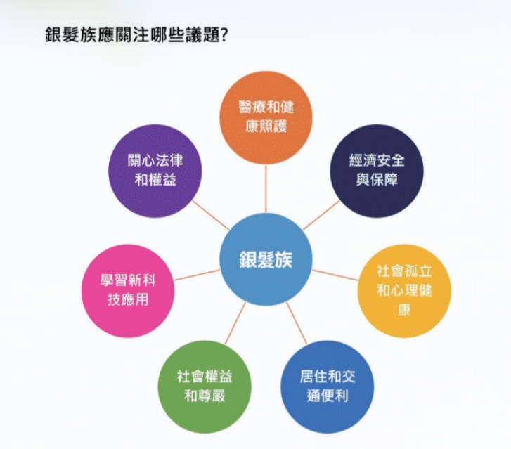 - 醫療和健康照護:關心健康、醫療可及性,以及長期照護需求。