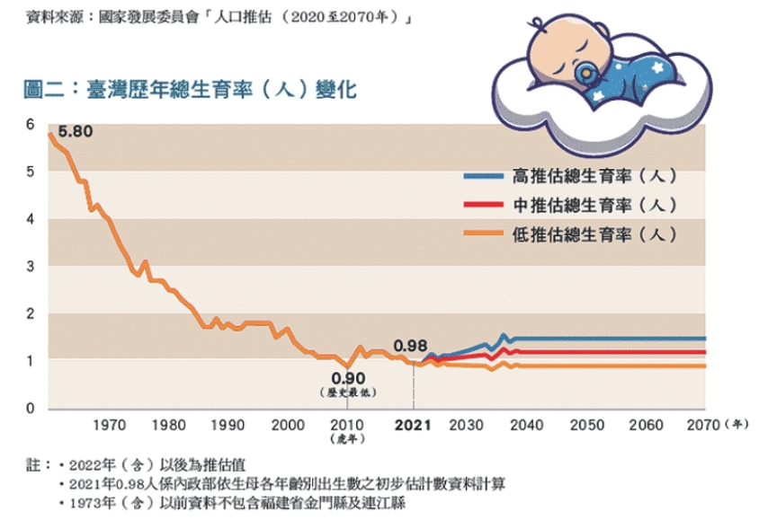 國家發展委員會的統計顯示,2021年台灣總生育率(人)為0.98,連續兩年跌破「1」,與半個世紀前(1960年)的5.8對比,有著天壤之別。事實上,在2020年台灣已進入「人口負成長時代」,即出生人數小於死亡人數,且有加速的趨勢,有人戲稱是「生不如死」的時代。