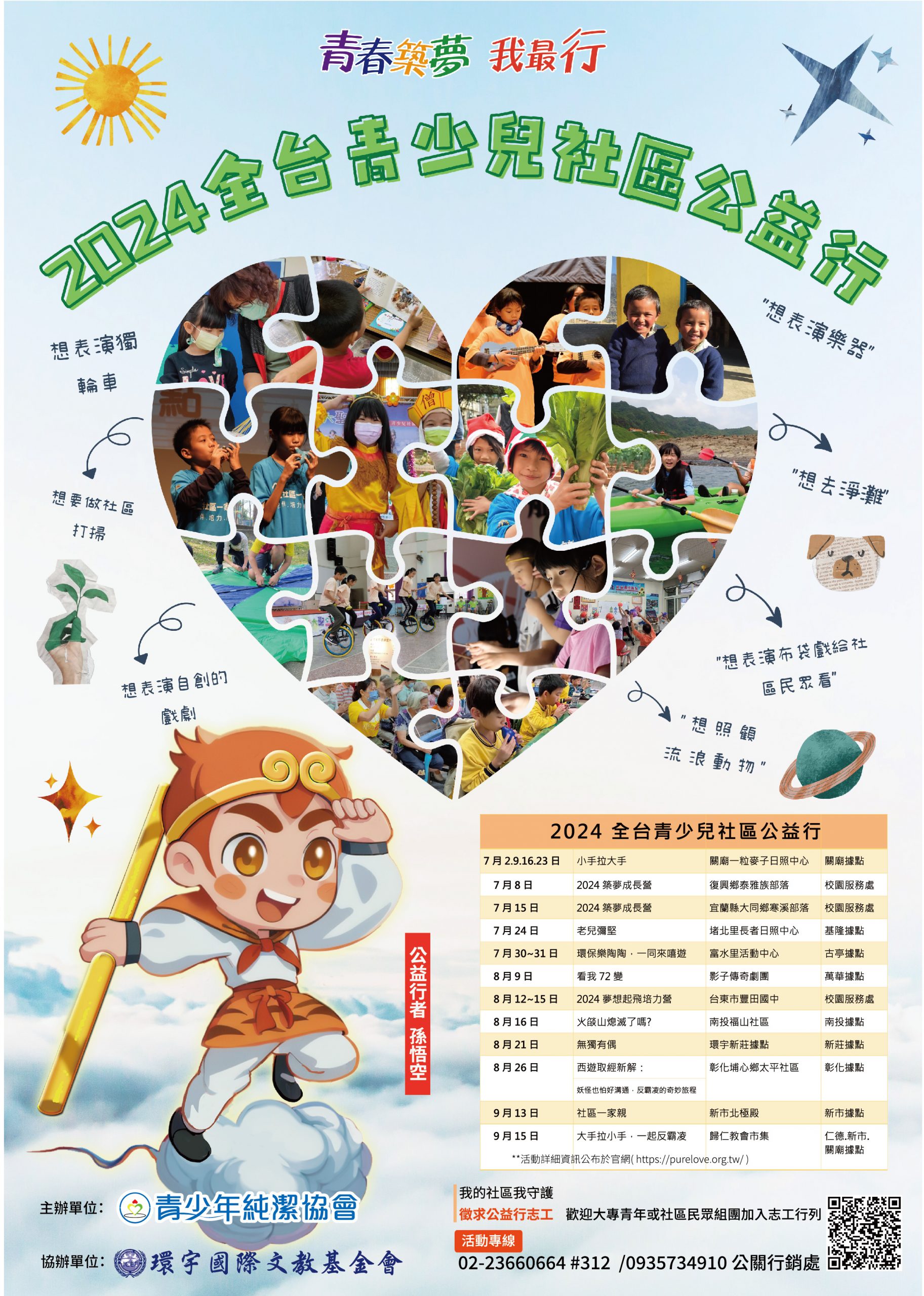 Posted on 2024-06-072024-11-27 by 顏 朝陽 我的社區我守護 徵求公益行志工 歡迎大專青年或社區民眾組團加入志工行列 活動專線: 02-23660664 #312 /0935734910 公關行銷處 主辦:青少年純潔協會 協辦:環宇文教基金會