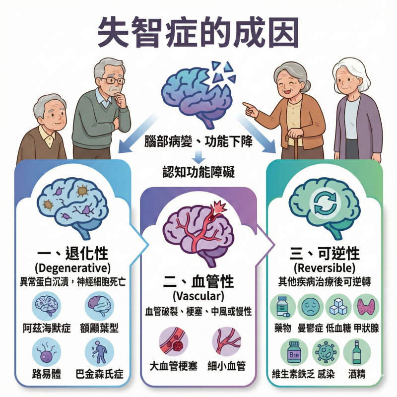 引起失智症的原因有哪些?失智是因為腦部病變、腦功能下降所引起,導致處理訊息的能力出現障礙,造成各種認知功能衰退,甚至喪失。大致可以分成以下三類型:
