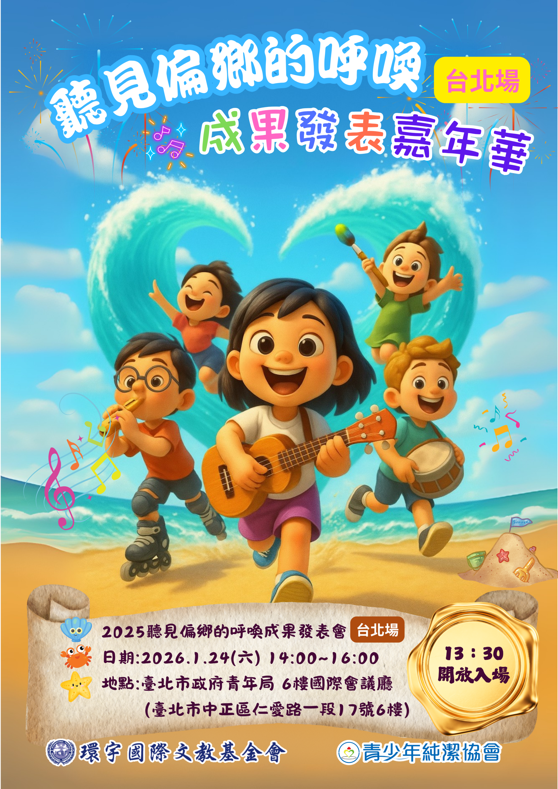 Posted on 2025-12-222025-12-31 by 顏 朝陽 【台北成果發表嘉年華】2025聽見偏鄉的呼喚✨ 📣 邀請您來聽故事、看見努力、感受溫馨💛 👉 搶先報名:https://www.surveycake.com/s/8knrK 🎁 還能帶走我們的小小心意限量伴手禮! 🙏 免費入場,座位有限! 日期:2026.1.24(六) 14:00~16:00 地點:臺北市政府青年局 6樓國際會議廳 (臺北市中正區仁愛路一段17號6樓) 歡迎蒞臨觀賞 🙌 歡迎分享給親友,一起來共襄盛舉 😊